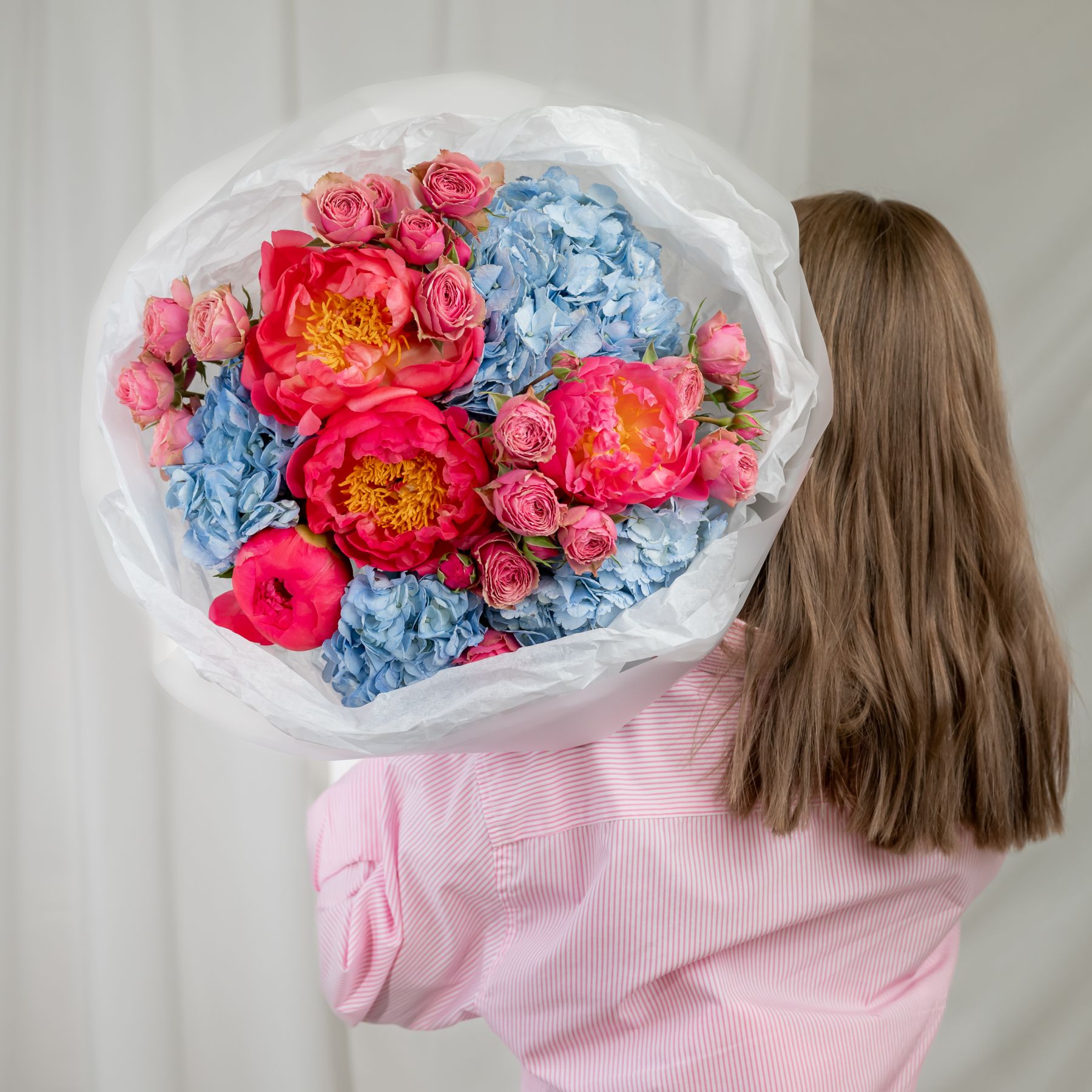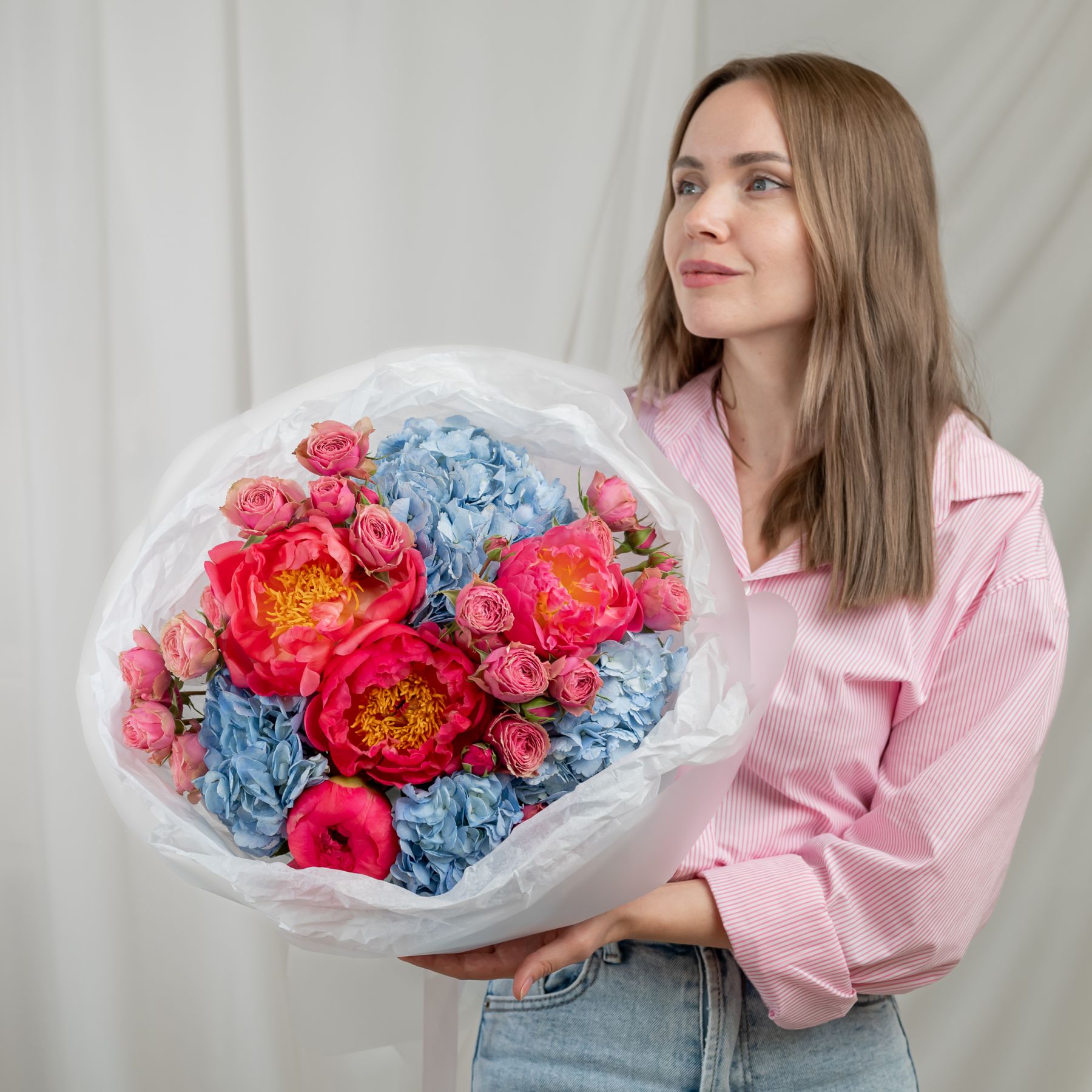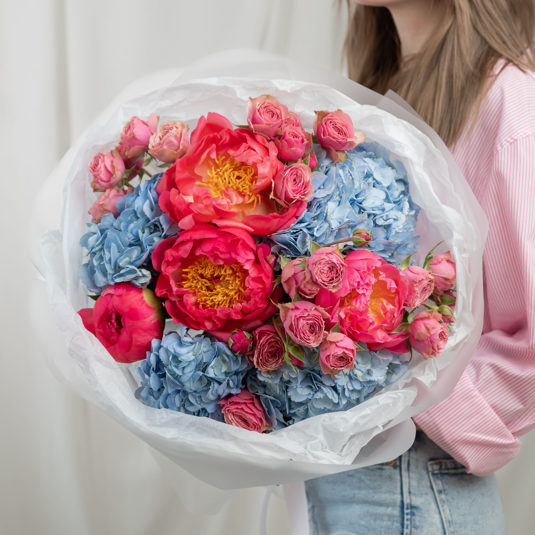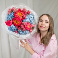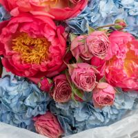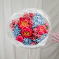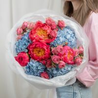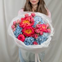 В составе пион (сорт Коралл Шарм) 4 шт, гортензия 4 шт, кустовая пионовидная роза 4 шт, упаковка дизайнерская.