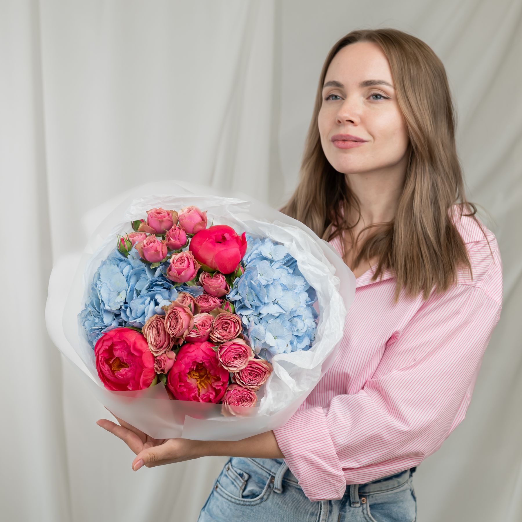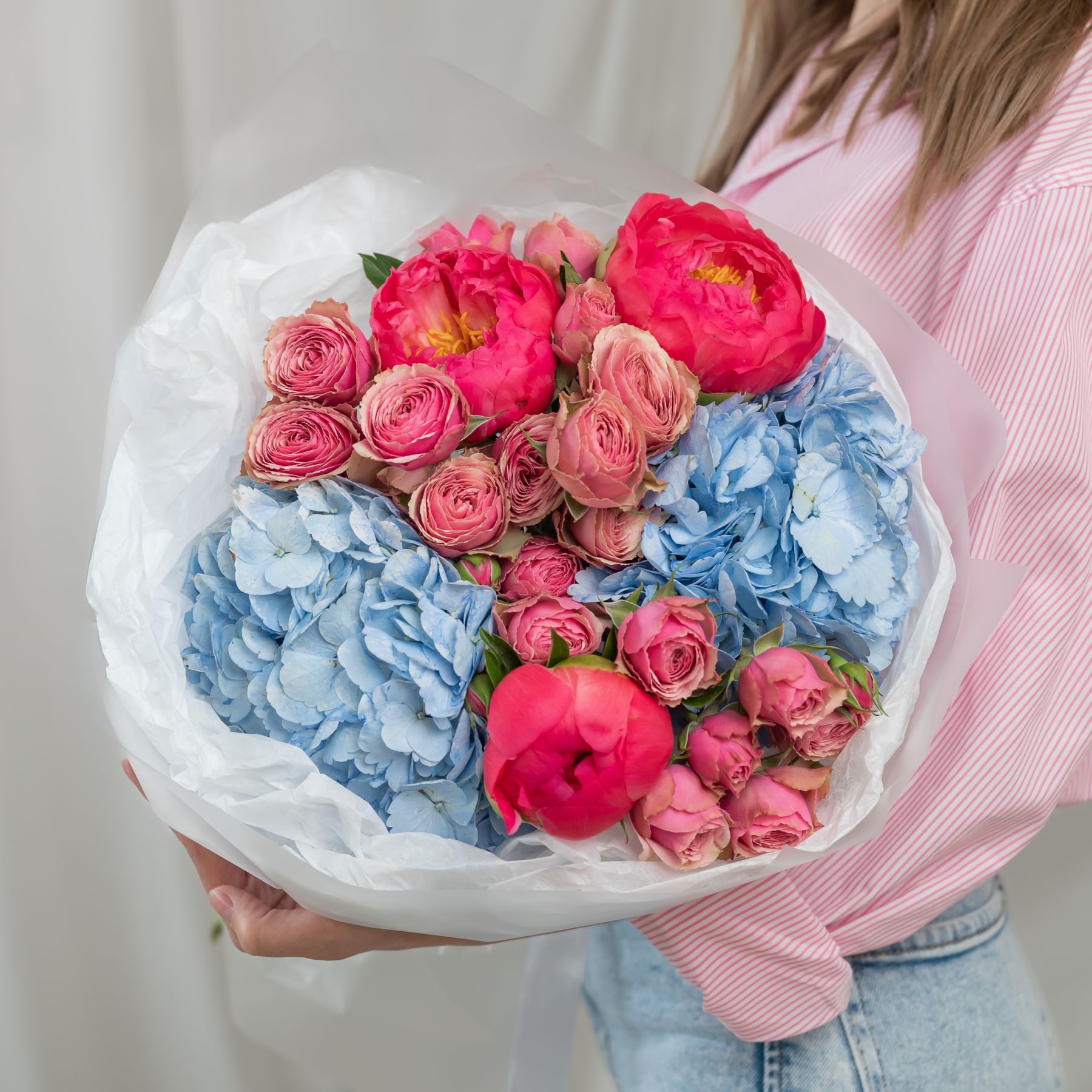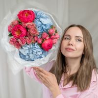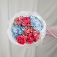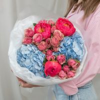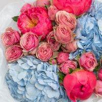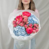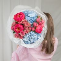 В составе пион (сорт Коралл Шарм) 3 шт, гортензия 2 шт, кустовая пионовидная роза 3 шт, упаковка дизайнерская.