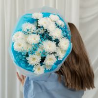 В составе хризантема кустовая (сорт Алтай0 5 шт, гипсфоила голубая 2 шт, упаковка дизайнерская.