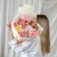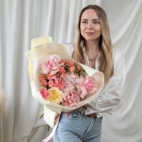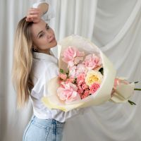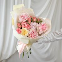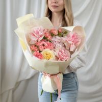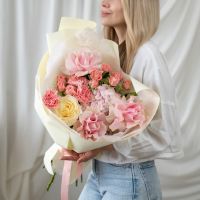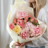 В составе французская роза 3 шт, гортензия 1 шт, роза (сорт Кендл Лайт) 1 шт, диантус 3 шт, кустовая роза 2 шт, упаковка дизайнерская.