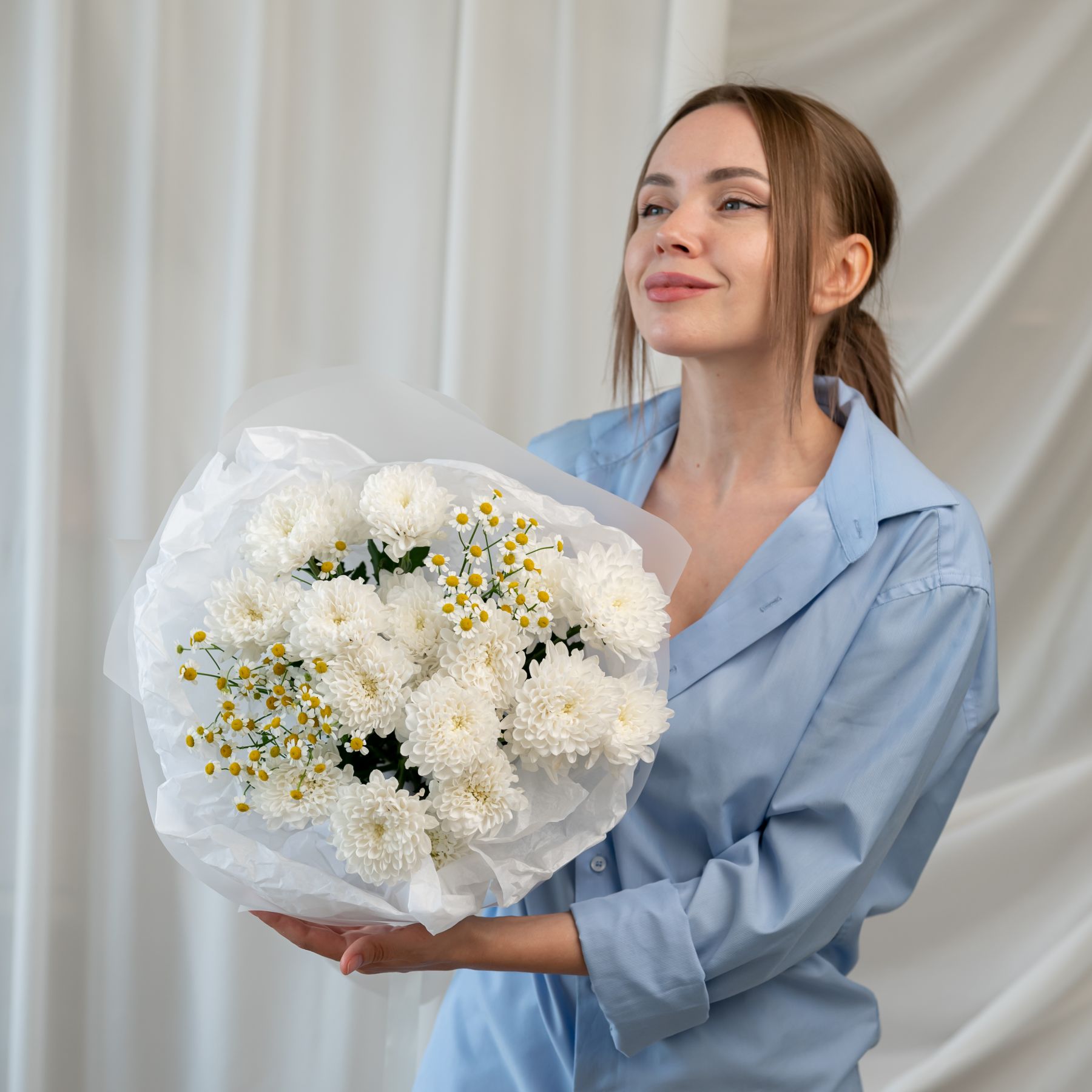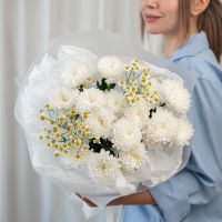 В составе хризантема кустовая (сорт Алтай) 3 шт, матрикария 2 шт, упаковка дизайнерская.