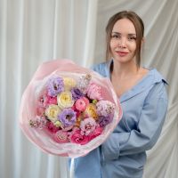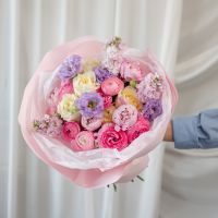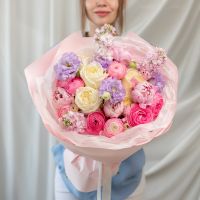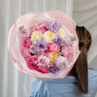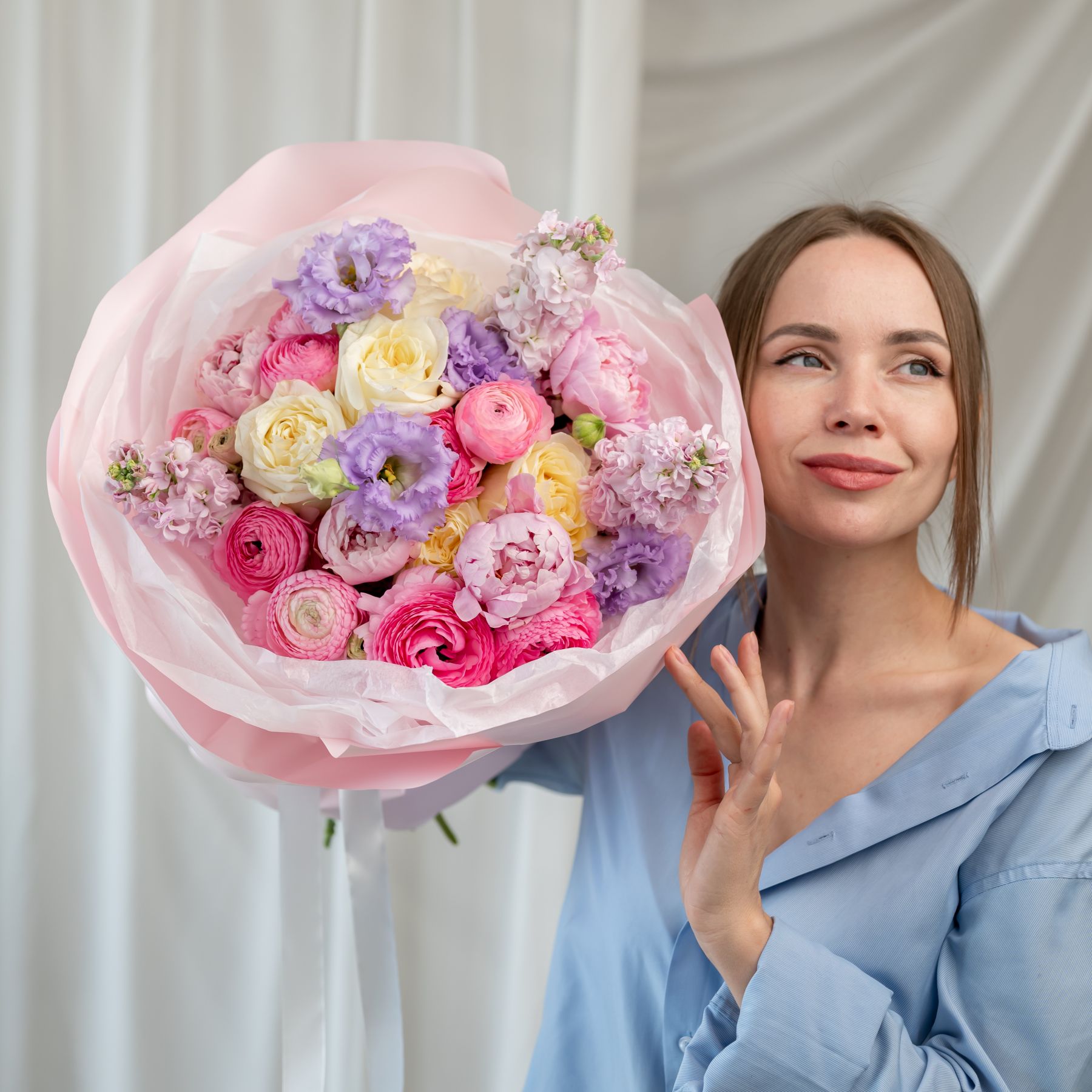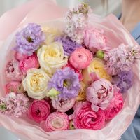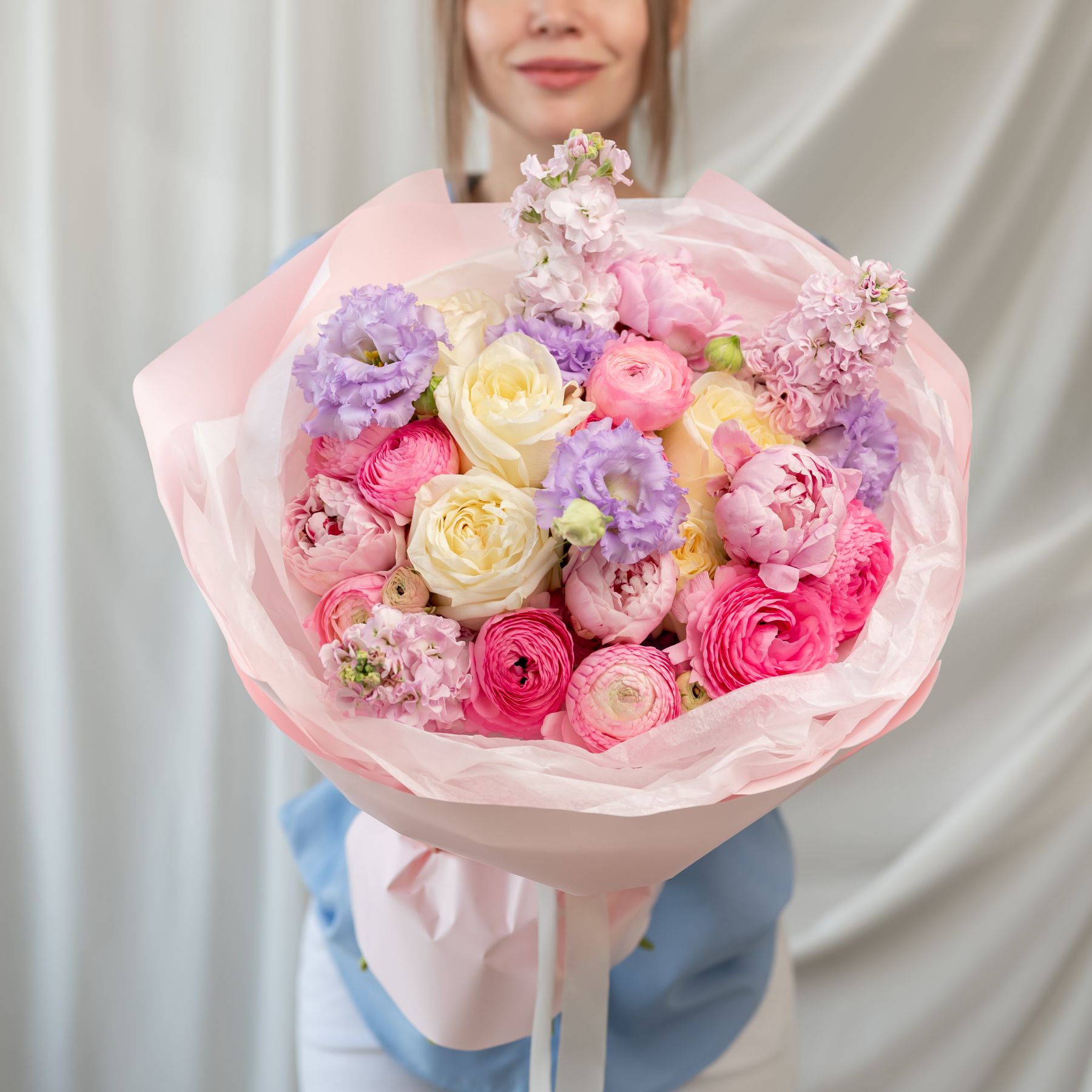 В составе маттиола 3 шт, эустома 1 шт, роза кремовая (сорт Кендл Лайт) 5 шт, пион 4 шт, ранункулюс 9 шт, упаковка дизайнерская.