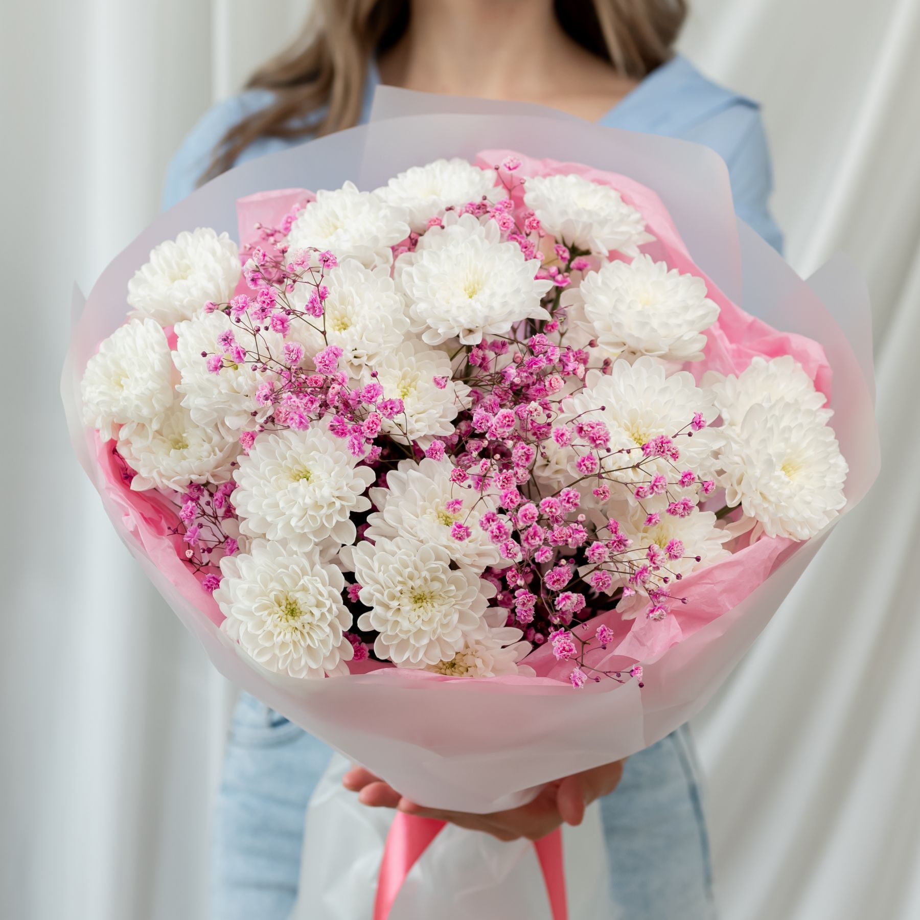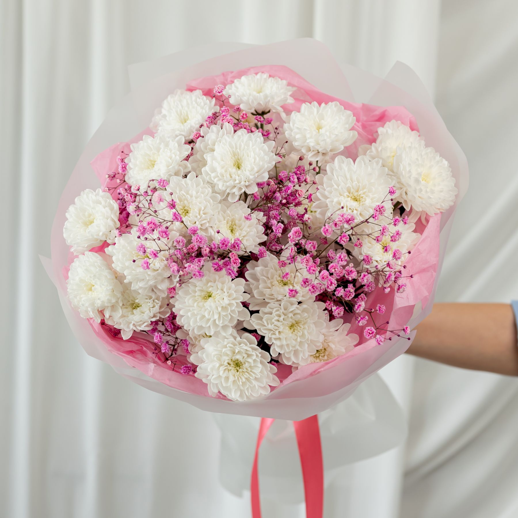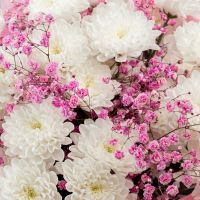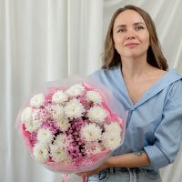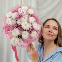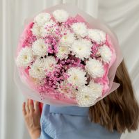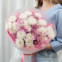 В составе хризантема кустовая (сорт Алтай) 5 шт, гипсофила розовая 2 шт, упаковка дизайнерская.