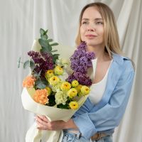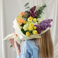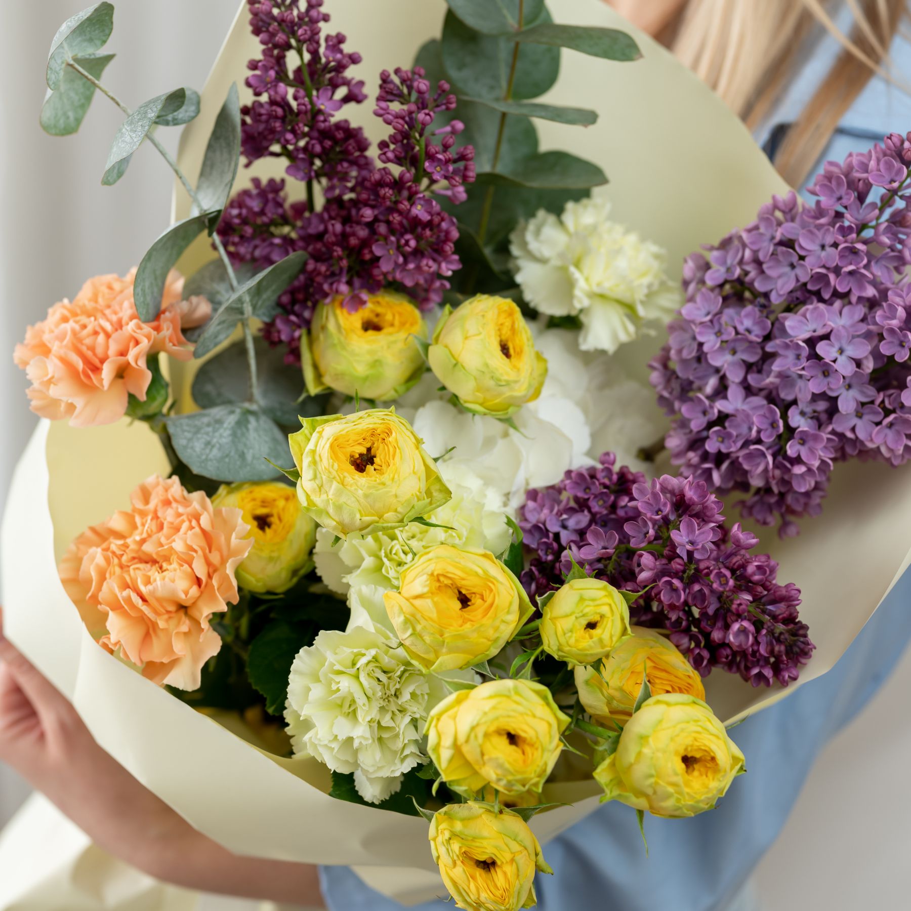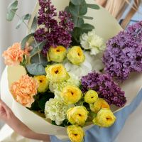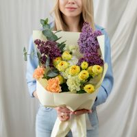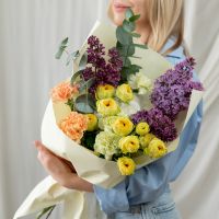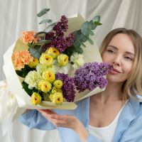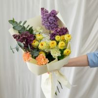 В составе сирень 2 шт, кустовая пионовидная роза 2 шт, диантус 5 шт, горетнзия 1 шт, эвкалипт 2 шт, упаковка дизайнерская.