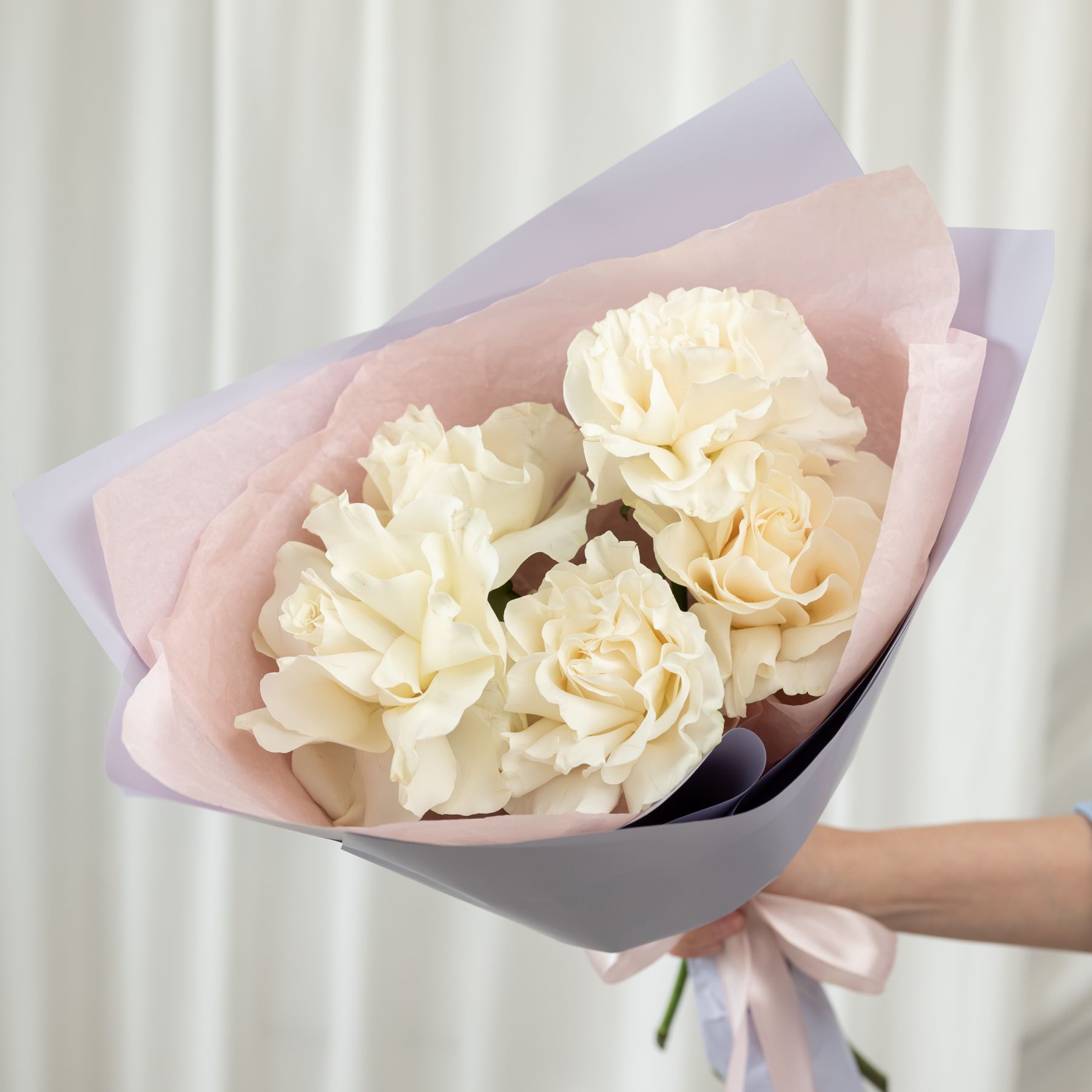 В составе 5 Французскиз роз (сорт Мондиаль) в объемной красивой упаковке.