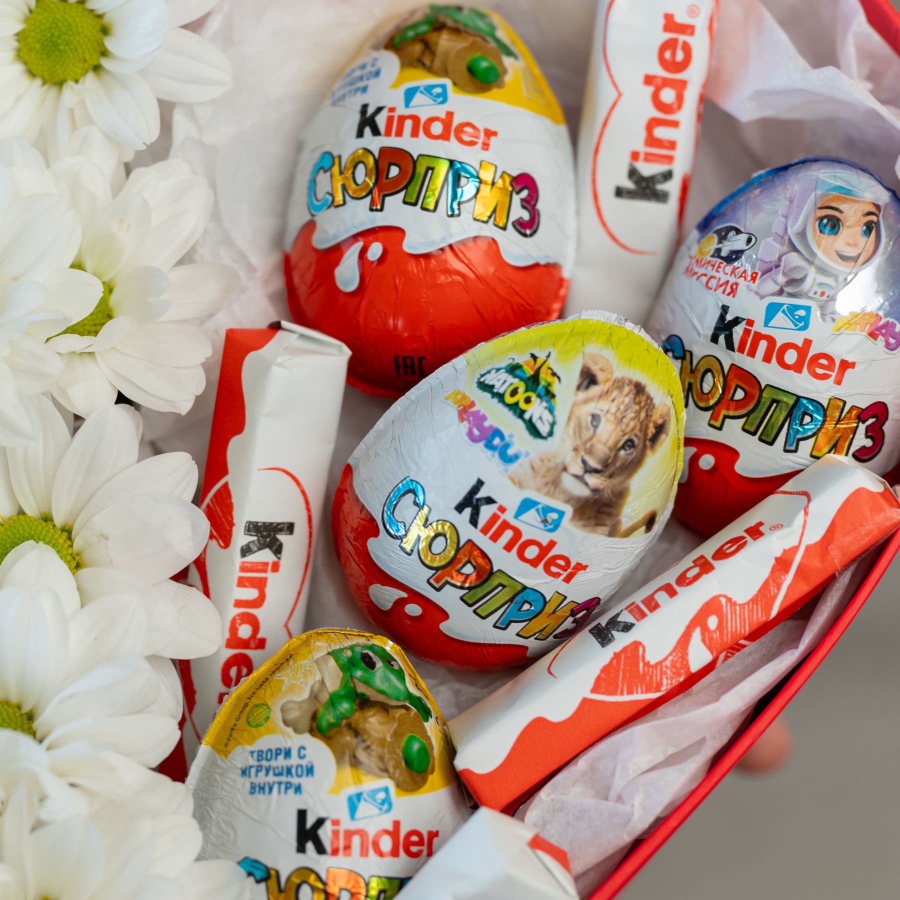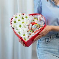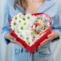 В составе хризантема кустовая (сорт Бакарди) 3 шт, сладости микс 9 шт, сердце, флористическая губка.