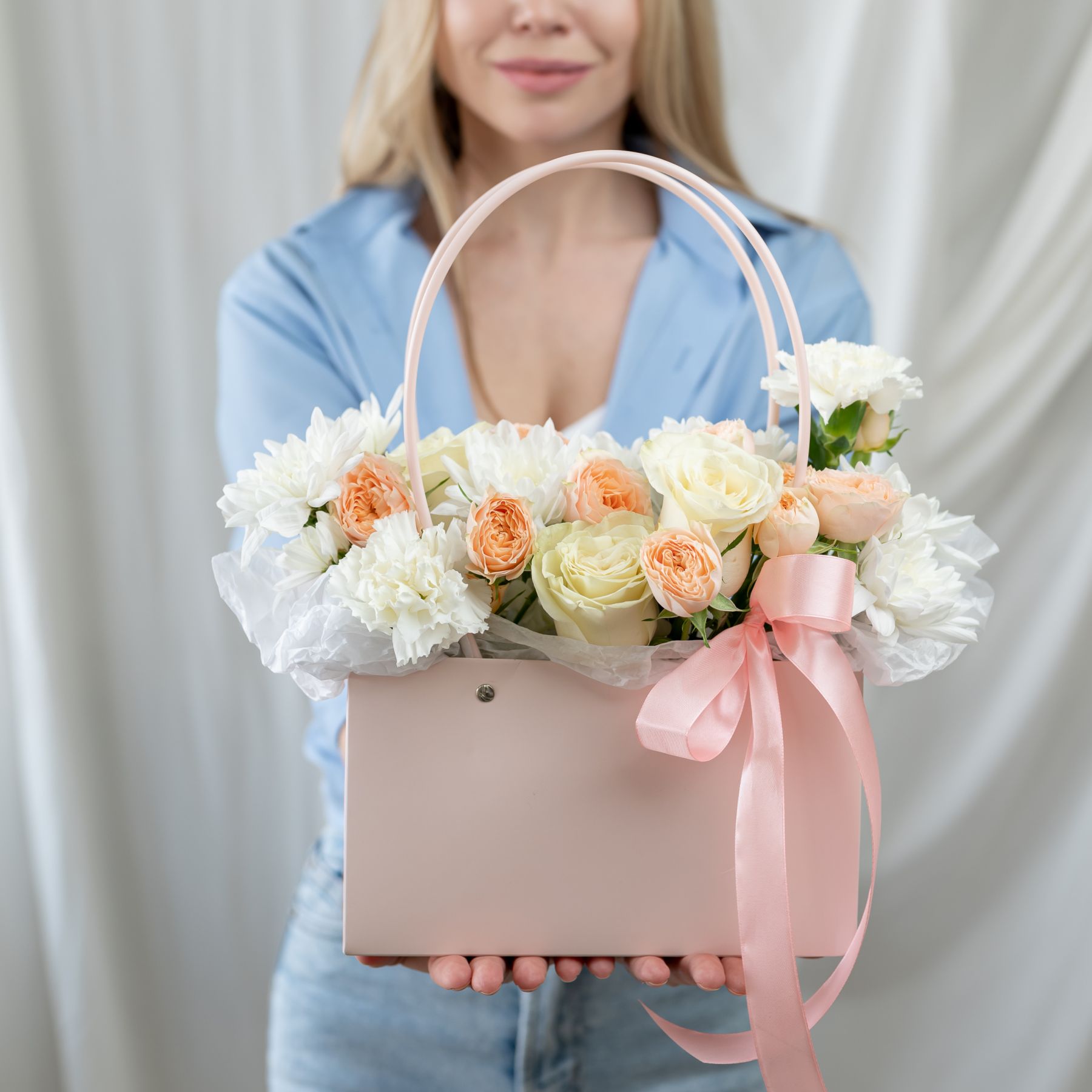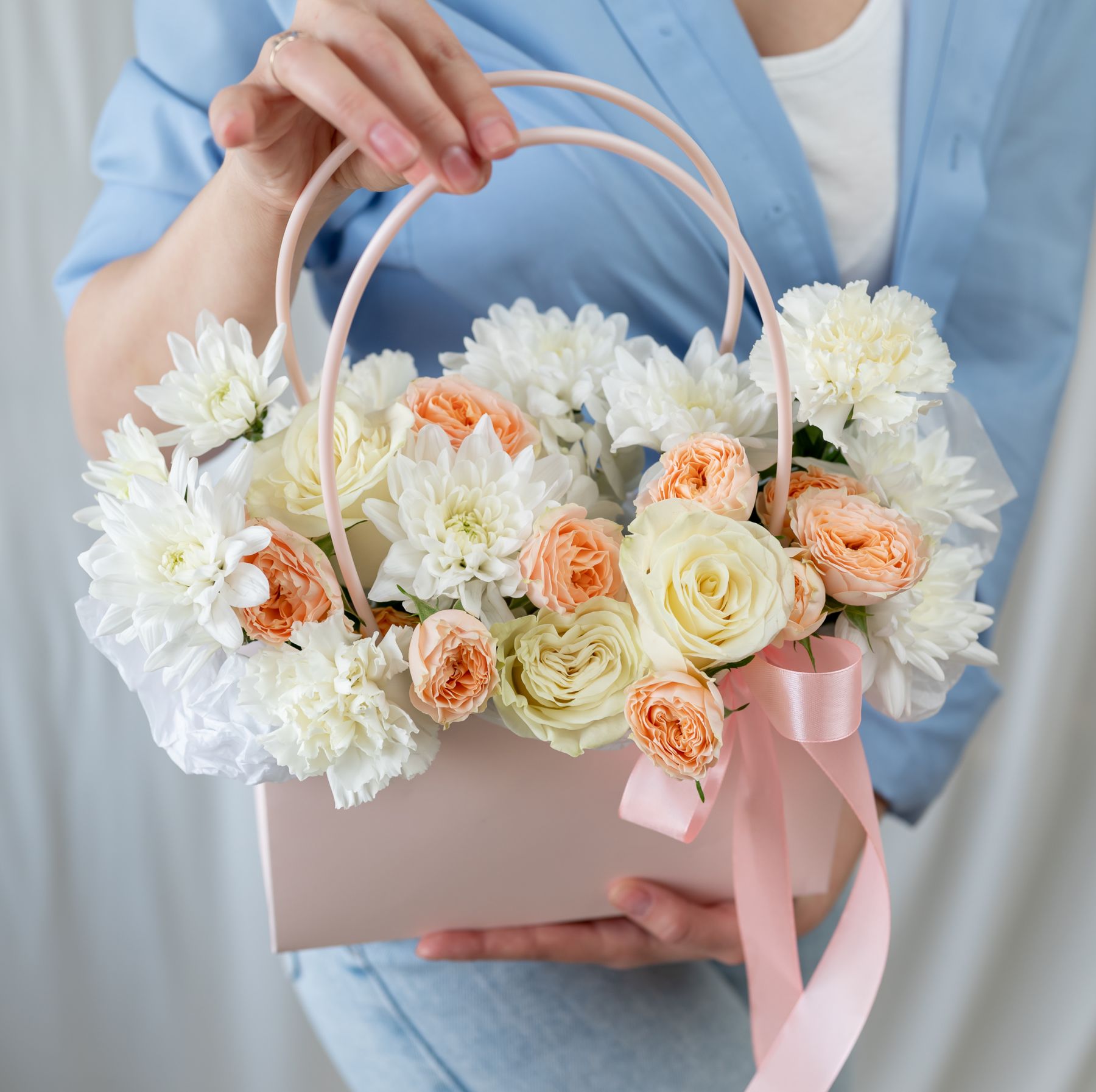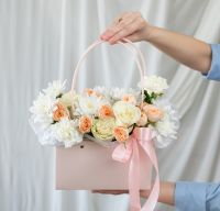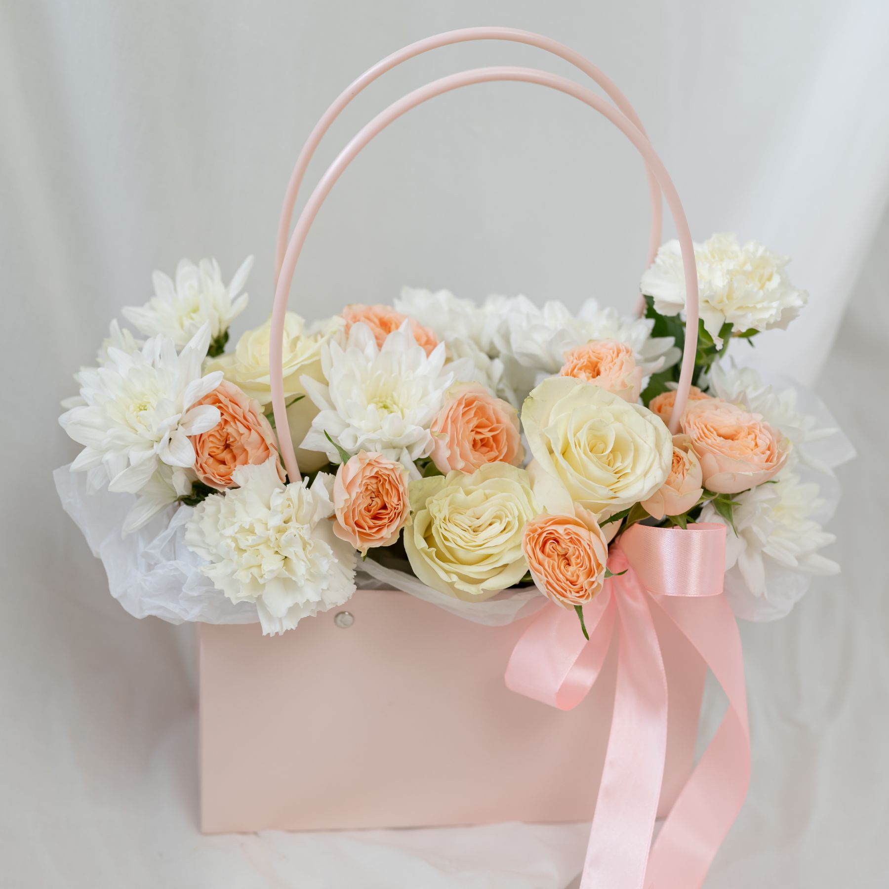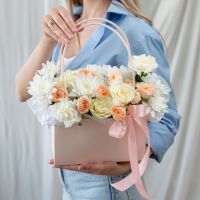 В составе хризантема кустовая (сорт Алтай) 2 шт, кустовая роза 2 шт, диантус 3 шт, роза одноголвая 3 шт, сумочка 1 шт, флористическая губка 1 шт.